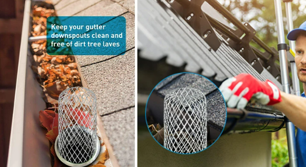 1. GUTTER CLEANING TOOL: The strainer prevents leaves, seeds and other debris clogging gutter downspout, keeps the water flow free. You're still going to occasionally clean out the debris accumulated around the strainer, much easier to clear the downspout inside.